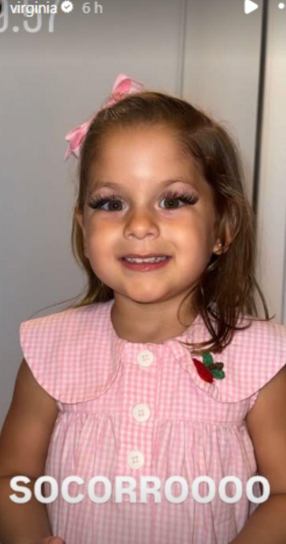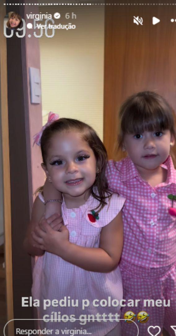 Nesta quarta-feira, Virginia fez seus seguidores rirem ao publicar nos stories do Instagram. Uma de suas filhas, Maria Flor, apareceu usando cílios postiços, combinados com um gloss da influenciadora.