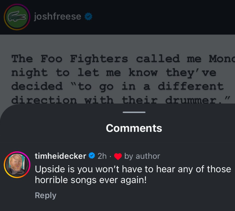 “O Foo Fighters me ligou segunda à noite para me avisar de que decidiram ‘seguir por uma direção diferente com seu baterista’. Nenhuma razão foi dada. Apesar disso, curti os dois últimos anos com eles, tanto dentro quanto fora do palco, e os apoio no que quer que eles sintam que é melhor para a banda. Em meus 40 anos de baterista profissional, nunca me tiraram de uma banda, então não estou irritado, mas um pouco chocado e desapontado. Porém, como muitos de vocês sabem, sempre trabalhei como freelancer e transitei entre bandas, então, está tudo bem. Fique ligado para a minha lista ‘Top 10 razões Josh foi tirado do Foo Fighters’.”