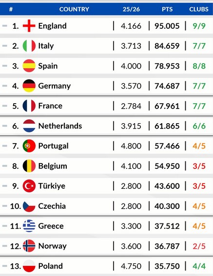O Ranking UEFA sofreu uma atualização durante esta quinta-feira, após as partidas da Europa League e a Conference League. No cômputo global, Portugal mantém-se na sétima posição, com 57.466 pontos, atrás dos Países Baixos (que continuam com todos os conjuntos em prova).