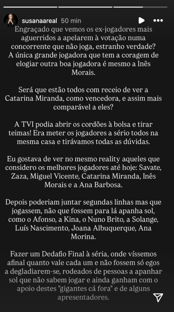 A profiler começou por deixar um recadinho bem azedo aos ex-vencedores dos reality shows: “Engraçado que vemos os ex-jogadores mais aguerridos a apelarem à votação numa concorrente que não joga, estranho verdade? A única grande jogadora que tem a coragem de elogiar outra boa jogadora é mesmo a Inês Morais. Será que estão todos com receio de ver a Catarina Miranda, como vencedora, e assim mais comparável a eles?”