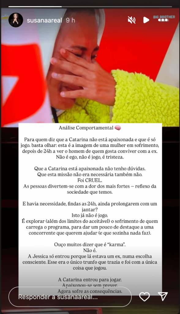 Cá fora, Susana Areal, especialista em comportamento humano, também reagiu nas suas redes sociais e ‘condenou’ a produção do programa e acusou-os de estarem a ‘explorar os sentimentos’ de Miranda e de quererem ajudar Jéssica, que segundo a profiler não faz nada no programa.