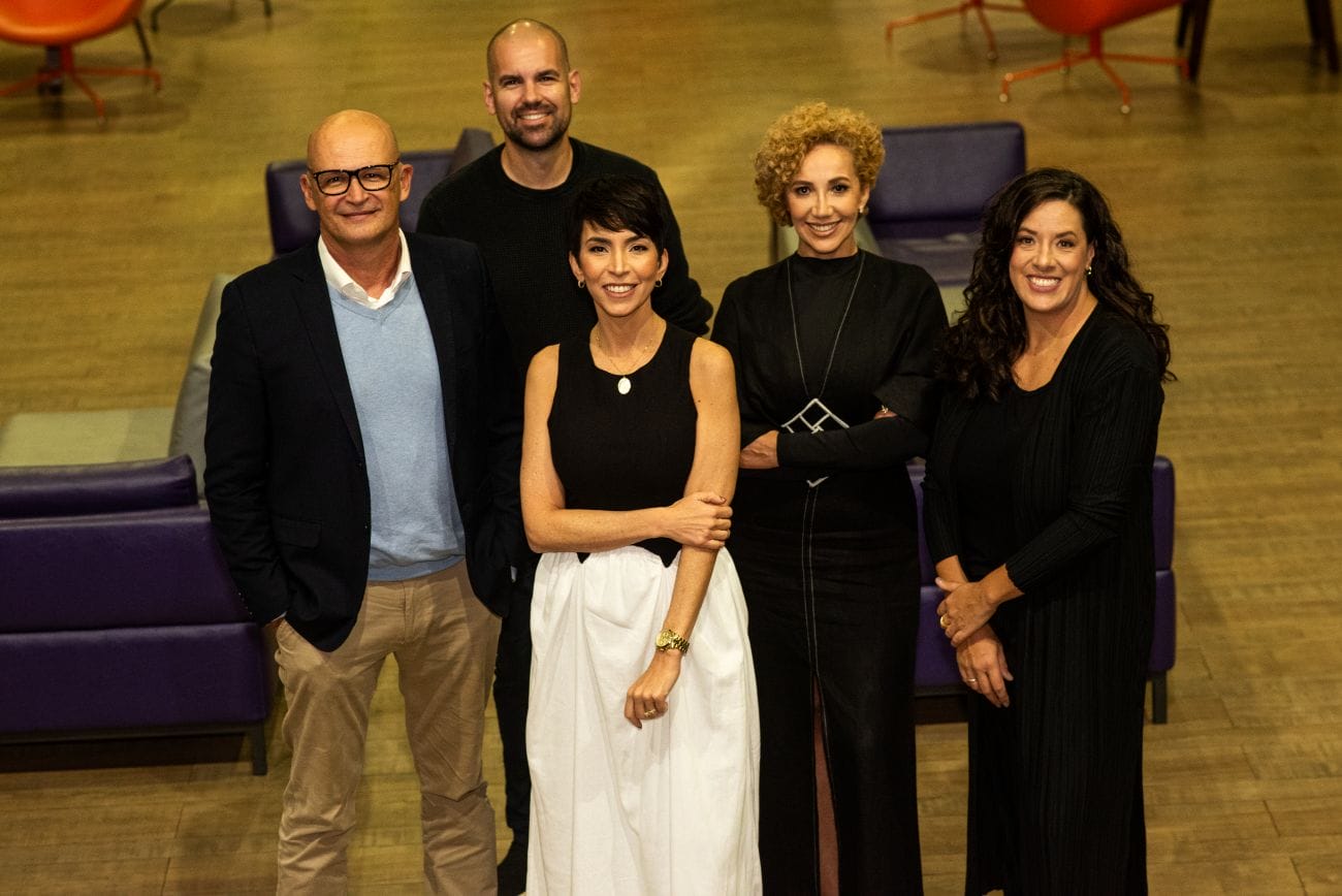 Os autores do início da série dos livros “Ponte para “Daniel Leipnitz e Rodrigo Lóssio, com idealizadoras da obra Marina Leite, Flavia Bittencourt e Cássia Carvalho (Foto: Alessandra Knobloch)