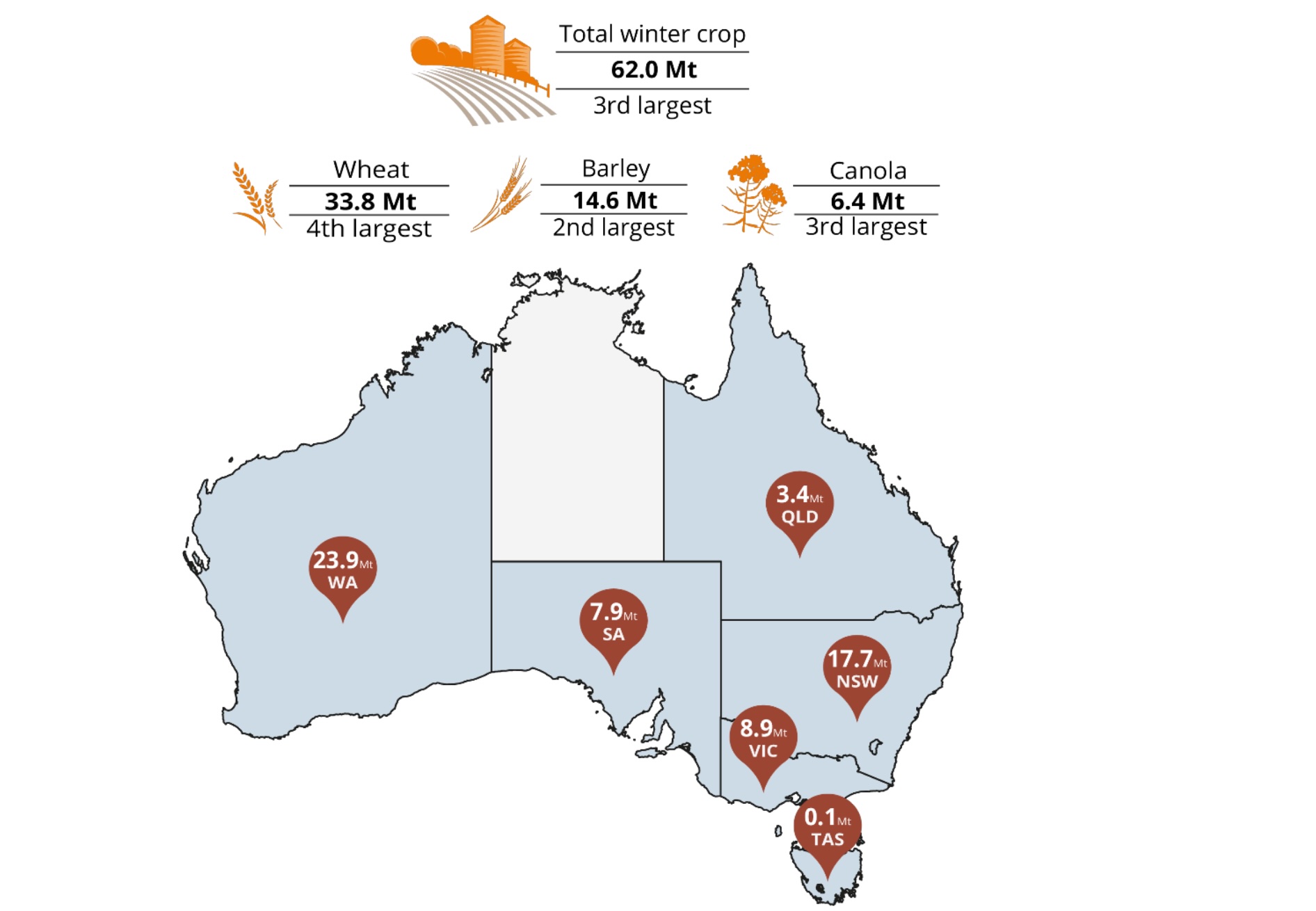 A safra de grãos de inverno da Austrália em 2025/26 deve atingir 62 milhões de toneladas, alta de 2% em relação ao ciclo anterior. Será a terceira maior produção já registrada, segundo o relatório do Escritório Australiano de Economia e Ciências Agrícolas e de Recursos (Abares).