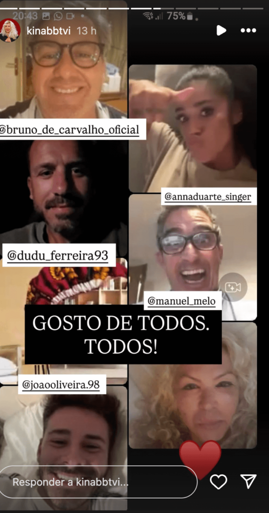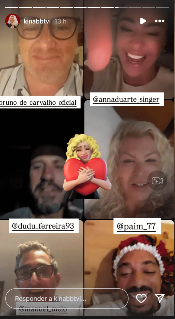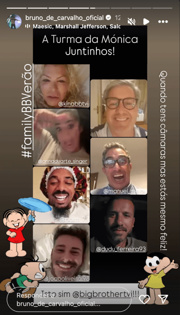 Ana Duarte, Bruno de Carvalho, Eduardo Ferreira, Fábio Paim, João Oliveira, Manuel Melo e Kina, juntaram-se numa live muito divertida nas redes sociais. Alguns dos ex-concorrentes partilharam alguns momentos nas redes sociais e deixaram mensagens especiais aos colegas: “Gosto de todos, todos”, disse Kina. “A Turma da Mónica juntinhos! Quando tem Câmaras mas estás feliz. Isto sim, Big Brother TVI.”, escreveu Bruno de Carvalho.