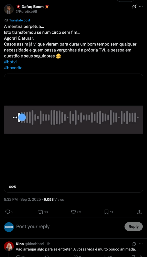 Casos assim já vi que vieram para durar um bom tempo sem qualquer necessidade e quem passa vergonhas é a própria TVI, a pessoa em questão e seus seguidores #bbtvi#bbverão pic.twitter.com/G52CRwzubN— Dafuq Boom (@PureExe99) September 2, 2025