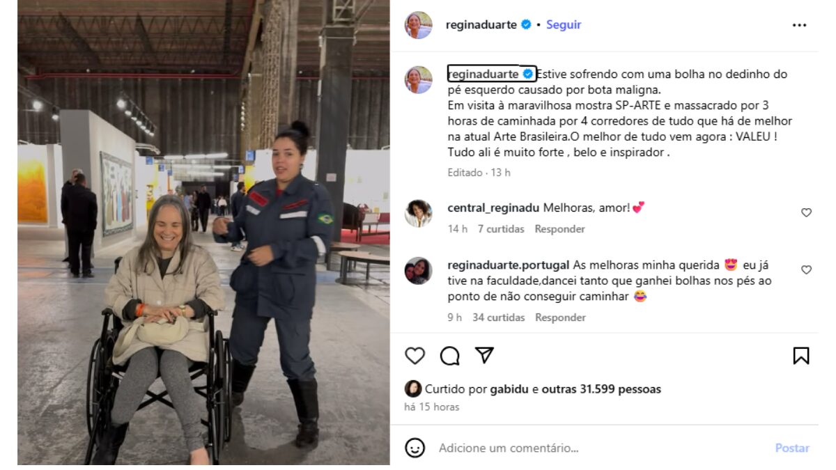 Aos 78 anos, Regina fez questão de explicar o motivo em seu Instagram sobre o porquê do uso da cadeira de rodas. Segundo a atriz, ela machucou o pé esquerdo por causa de um calçado.
