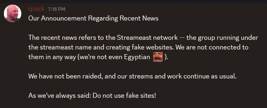 No entanto, o principal operador do Streameast, conhecido como Quick, confirmou no Discord que a ACE não fechou este site. Visou sim outros que são cópias falsas do original. “Não temos qualquer ligação a esses sites (nem somos egípcios)”, brinca Quick no Discord. “Não fomos alvos de qualquer intrusão e os nossos serviços de streaming operam normalmente. Como sempre dizemos: não usem sites falsos”.