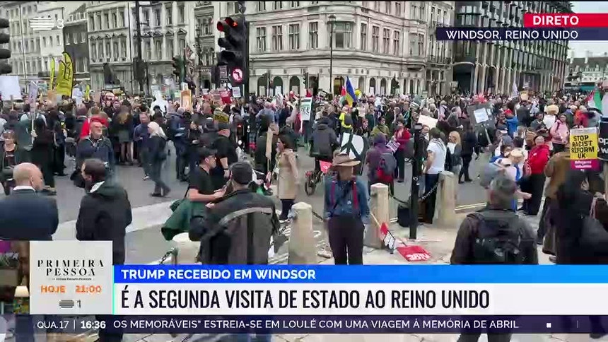 “Os migrantes são bem-vindos, Trump não é bem-vindo”, “Não ao racismo, não a Trump”, “Bombardear crianças em Gaza e festejar no Reino Unido”, pode ler-se nalguns cartazes.