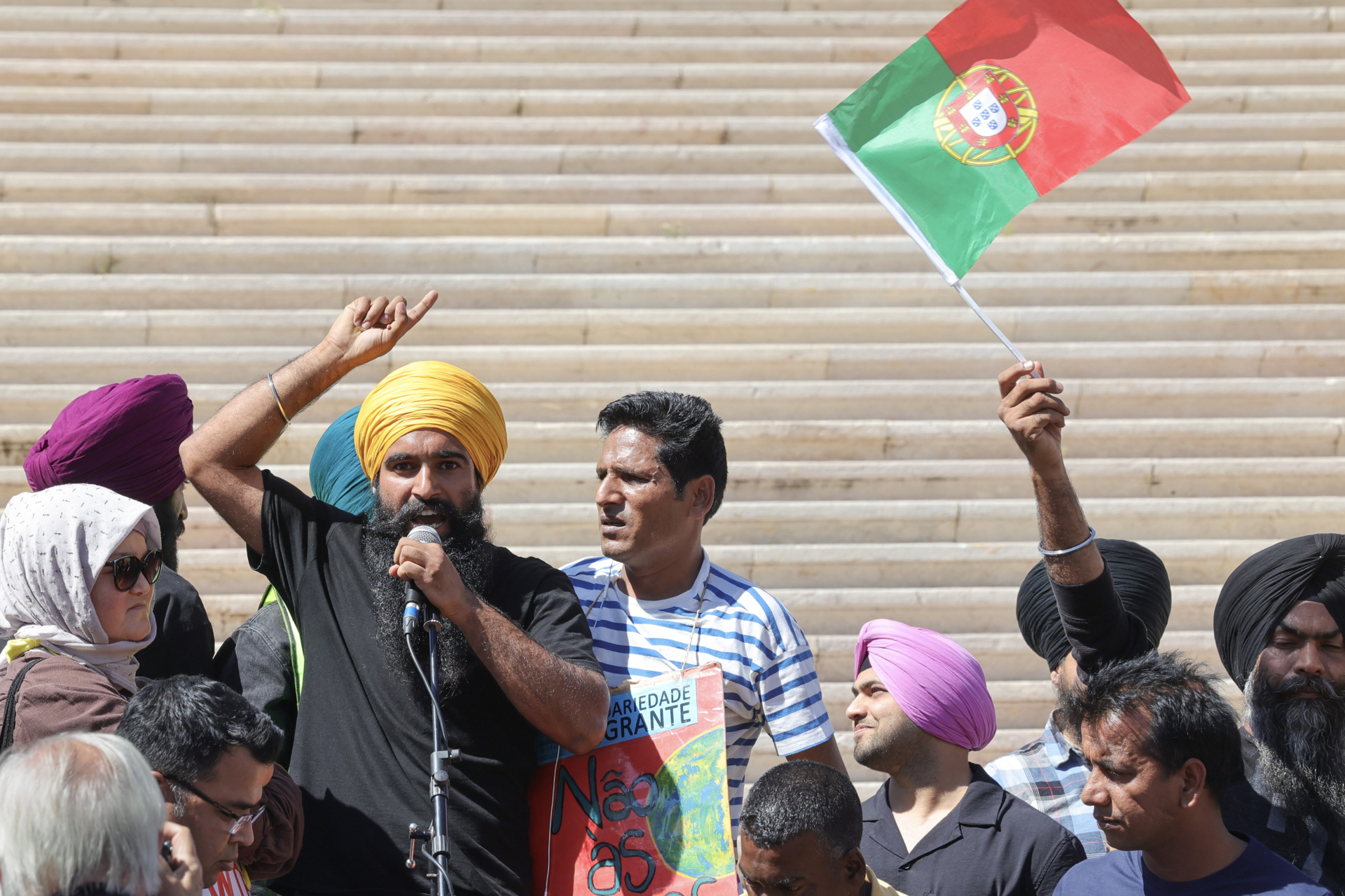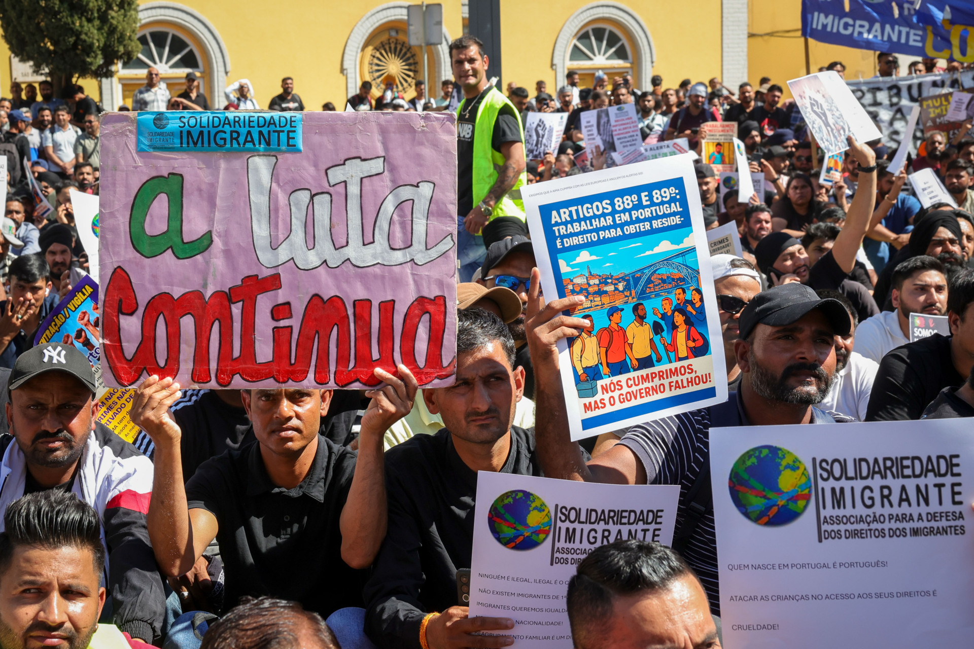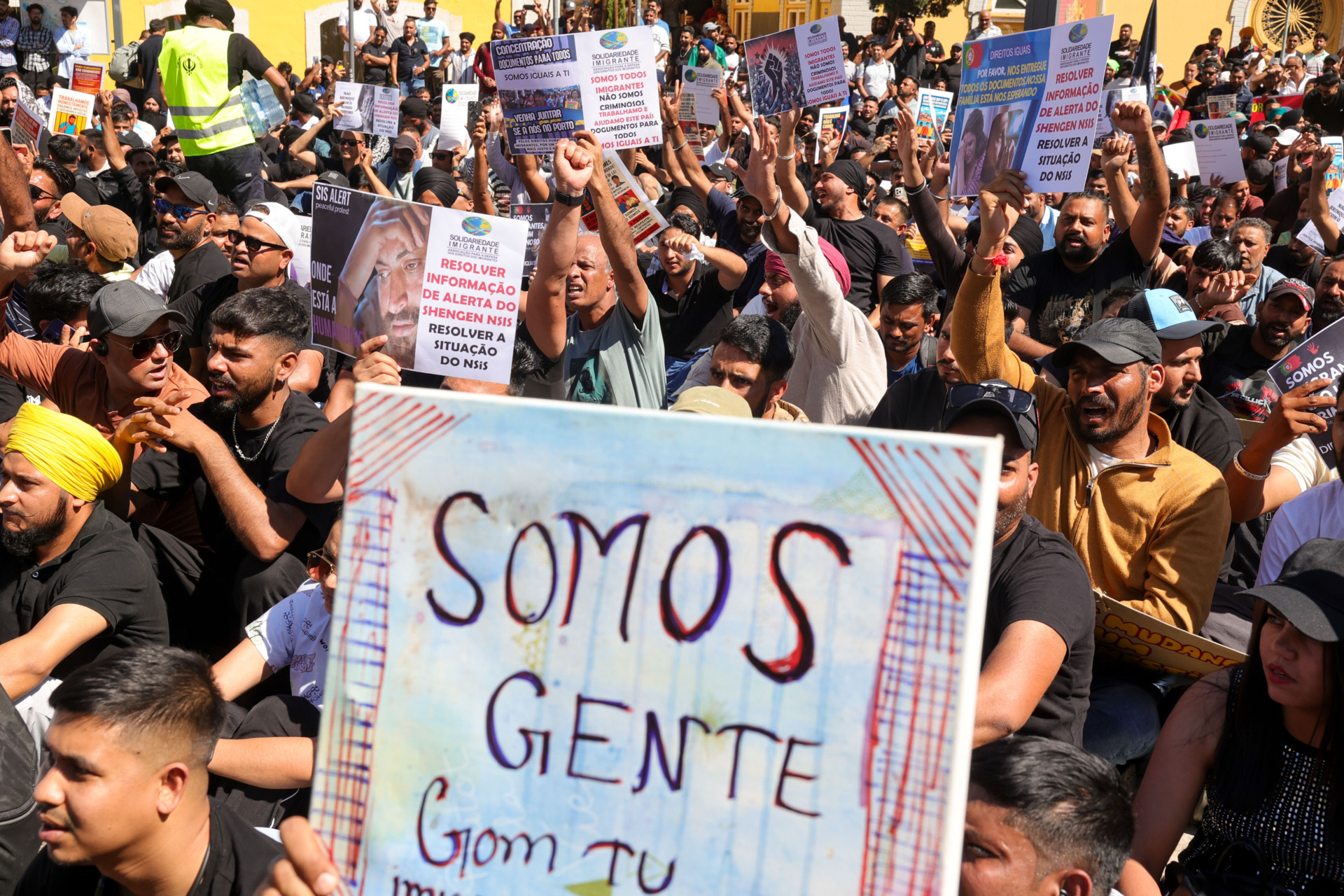 A concentração, promovida pela associação Solidariedade Imigrante, foi marcada para as 14 horas e, a essa hora, sob intenso calor, alguns manifestantes iam distribuindo águas.