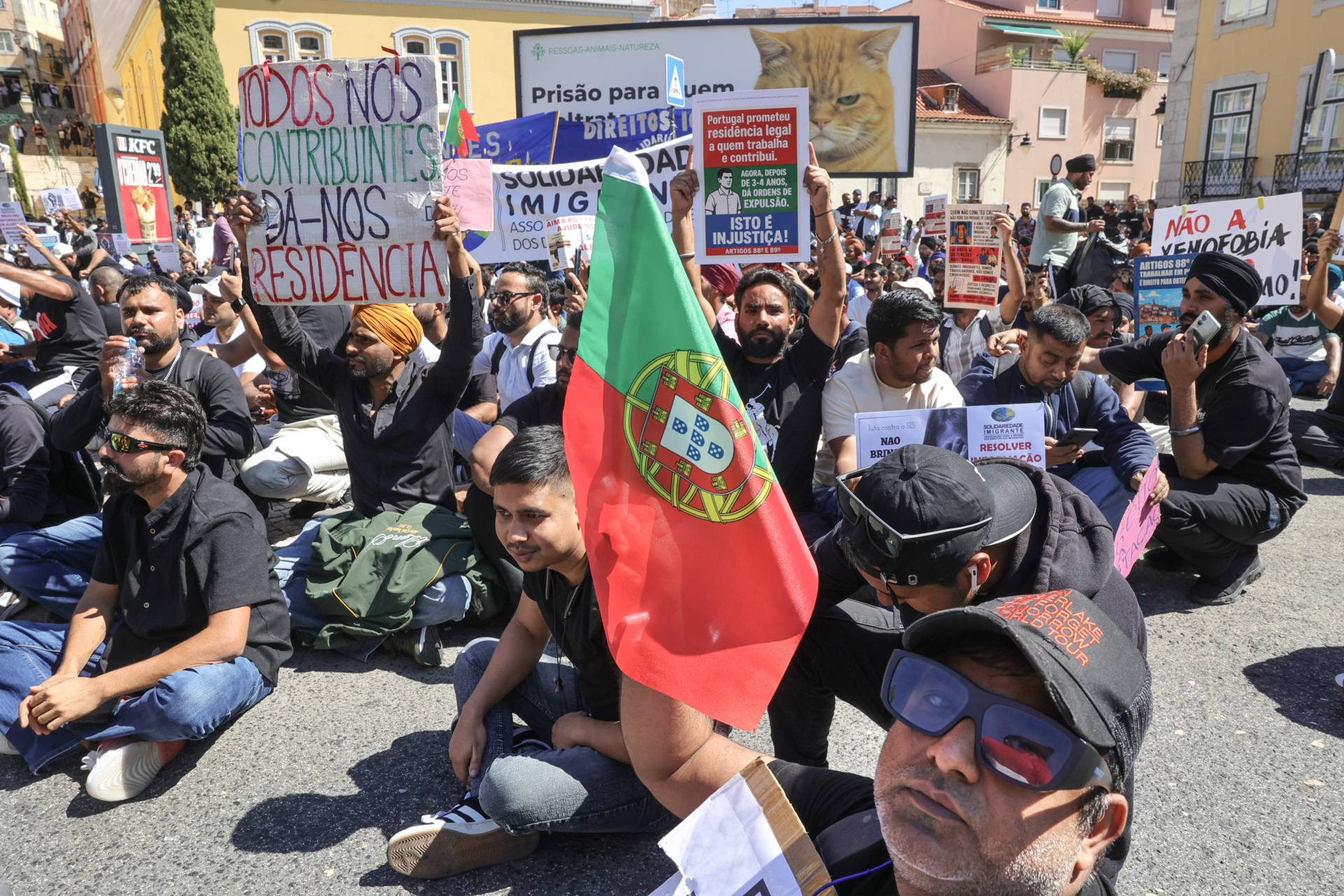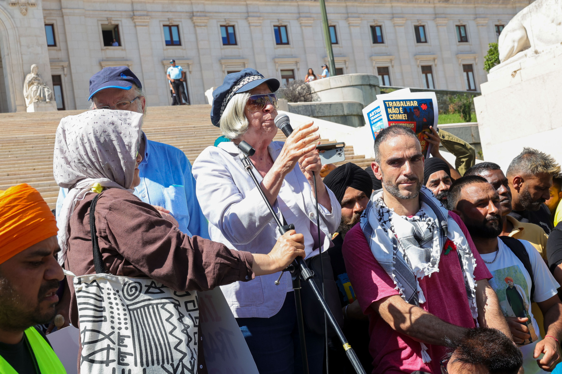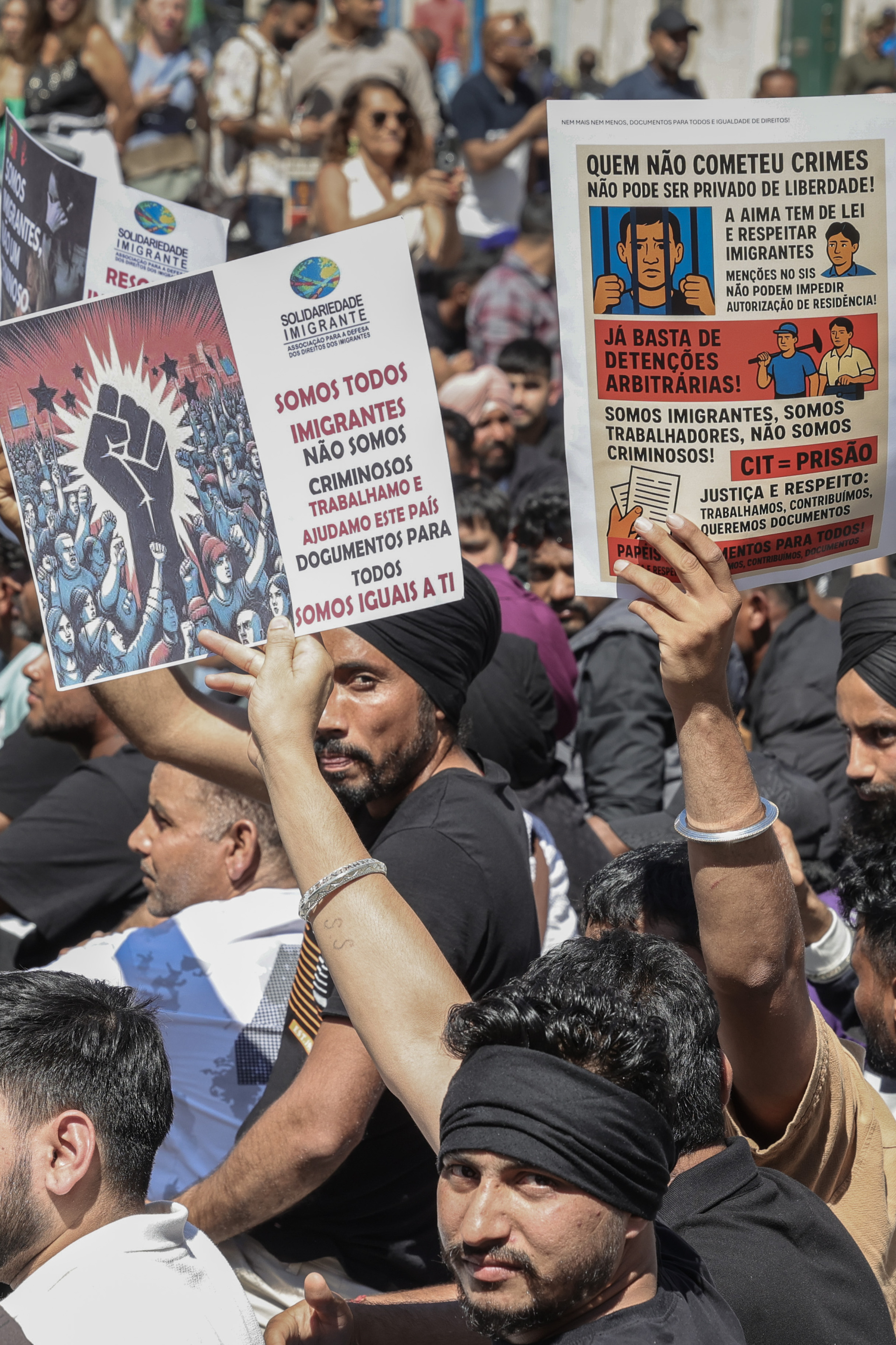 A concentração, promovida pela associação Solidariedade Imigrante, foi marcada para as 14 horas e, a essa hora, sob intenso calor, alguns manifestantes iam distribuindo águas.