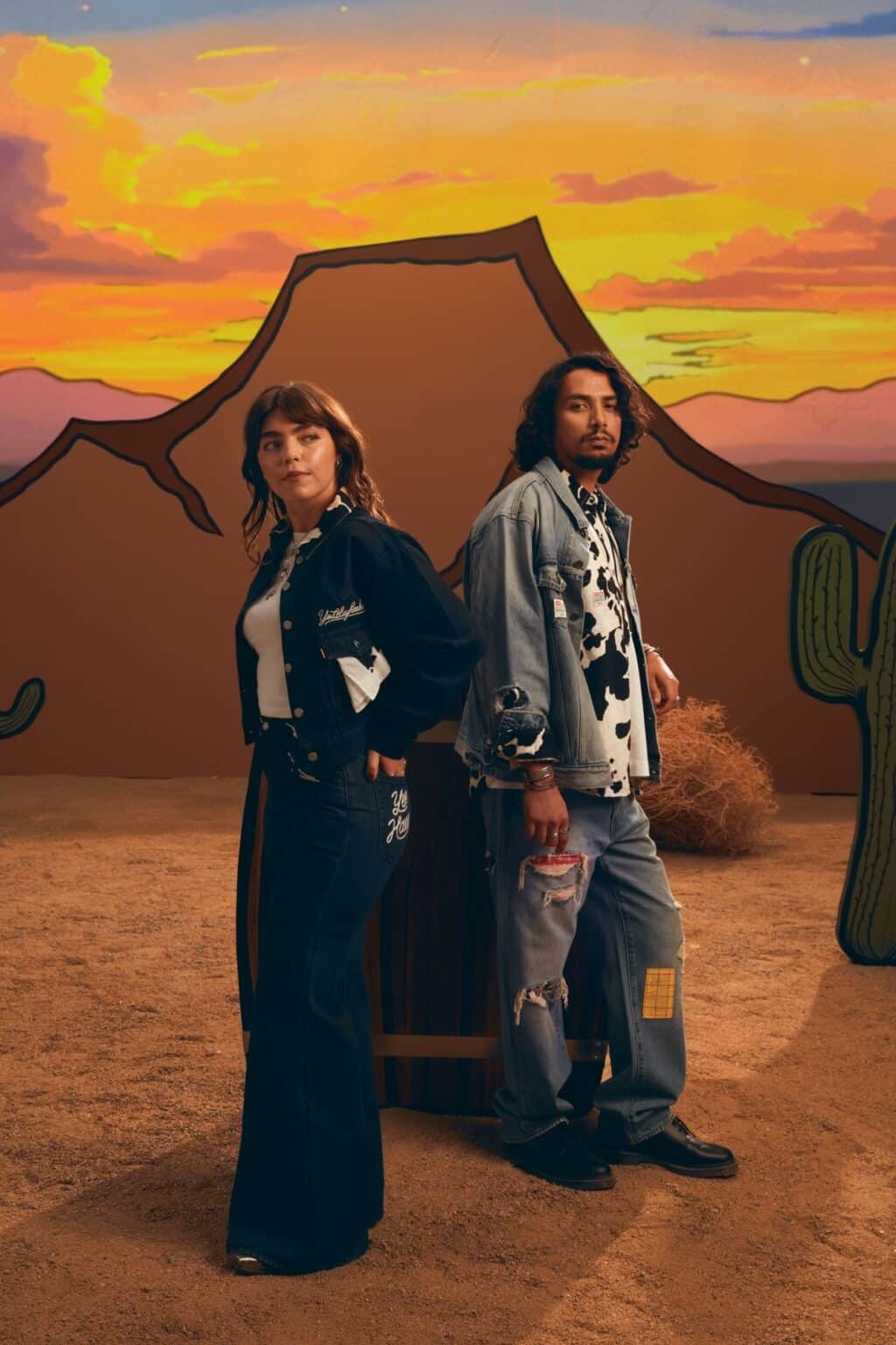 Modelo masculino e feminino apresentam a nova coleção da Levi’s em colaboração com a Disney e Pixar, inspirada no universo de Toy Story.
