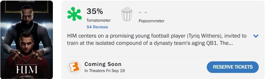 O aguardado terror esportivo ‘HIM’ (Ele) teve uma estreia morna no Rotten Tomatoes, alcançando apenas 35% de aprovação da crítica, com base em 54 avaliações até o momento.