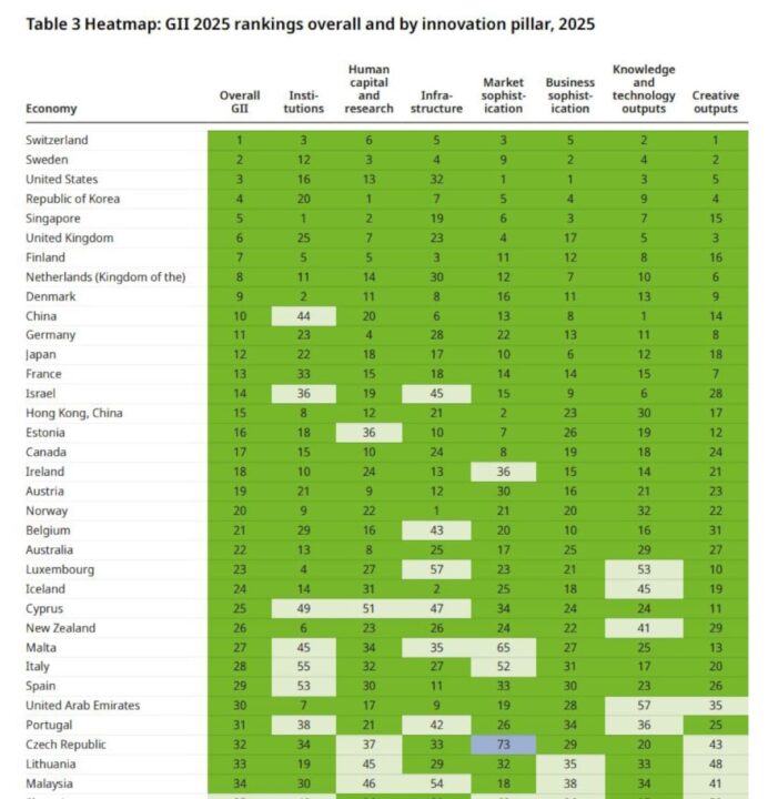 O GII 2025, que classificou os países usando dados de 2024, afirmou que houve um forte desempenho em economias de rendimento médio, como China, Índia, Turquia e Vietname, que continuam a subir no ranking.