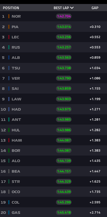Norris foi o primeiro piloto a liderar a sessão, com um tempo no segundo 44, seguido de muito perto por Charles Leclerc e Max Verstappen. George Russell (ainda a recuperar de uma virose que praticamente lhe roubou a voz) tratou de melhorar o registo e instalar-se no topo, uma estadia que seria curta, pois Norris voltou a agarrar o primeiro lugar da tabela, sendo o primeiro a entrar no segundo 43.