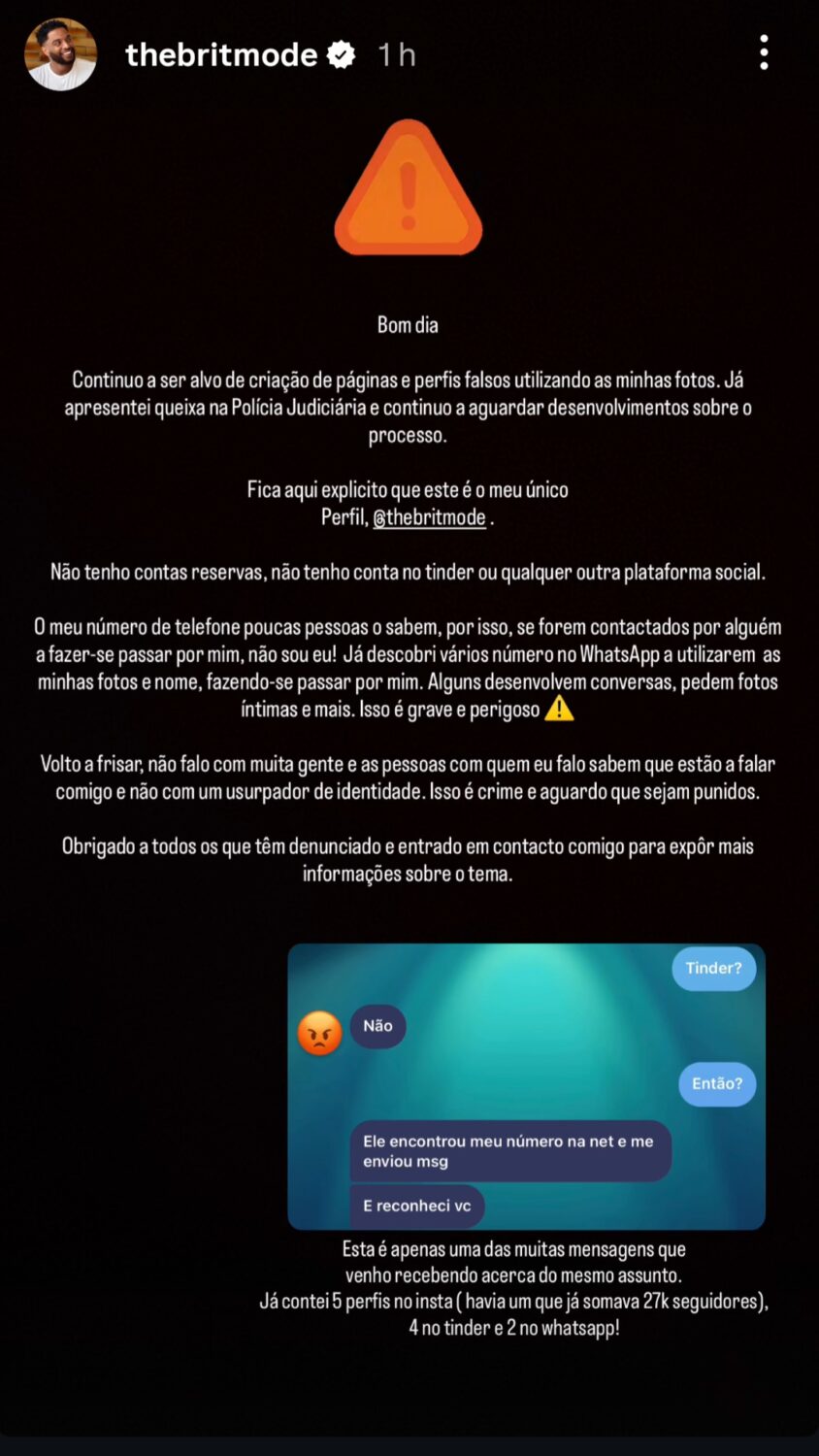 «Continuo a ser alvo de criação de páginas e perfis falsos utilizando as minhas fotos. Já apresentei queixa na Polícia Judiciária e continuo a aguardar desenvolvimentos sobre o processo. Fica aqui explícito que este é o meu único perfil, @thebritmode», escreveu.