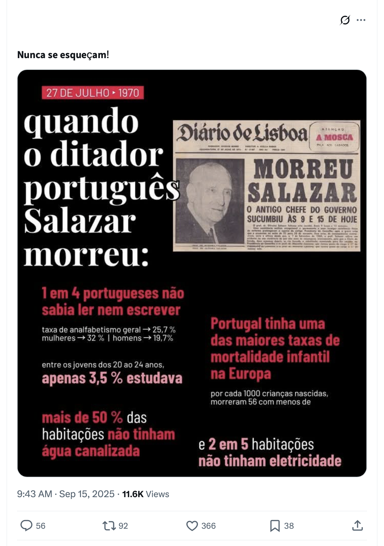 De resto, nesse mesmo ano da morte de Salazar, a taxa de mortalidade infantil registada em Portugal era uma das mais elevadas da Europa: 55,5‰, isto é, morriam 55,5 crianças com menos de um ano de idade por cada 1.000 nascimentos. Em 2024 fixou-se em 3‰, uma das mais baixas do mundo.