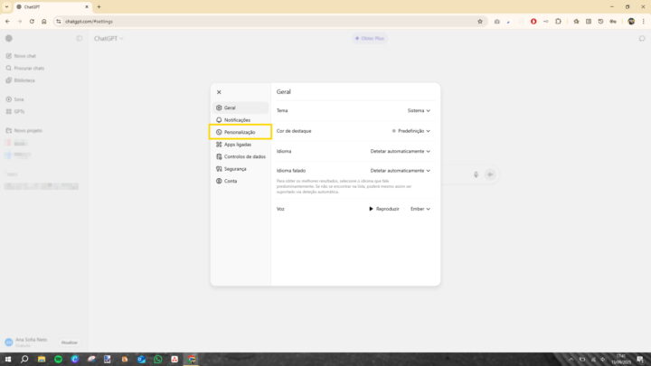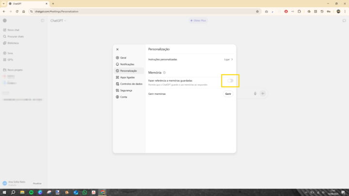 Depois, aceda ao menu Personalização e ative o botão que “Permite que o ChatGPT guarde e use memórias ao responder”.