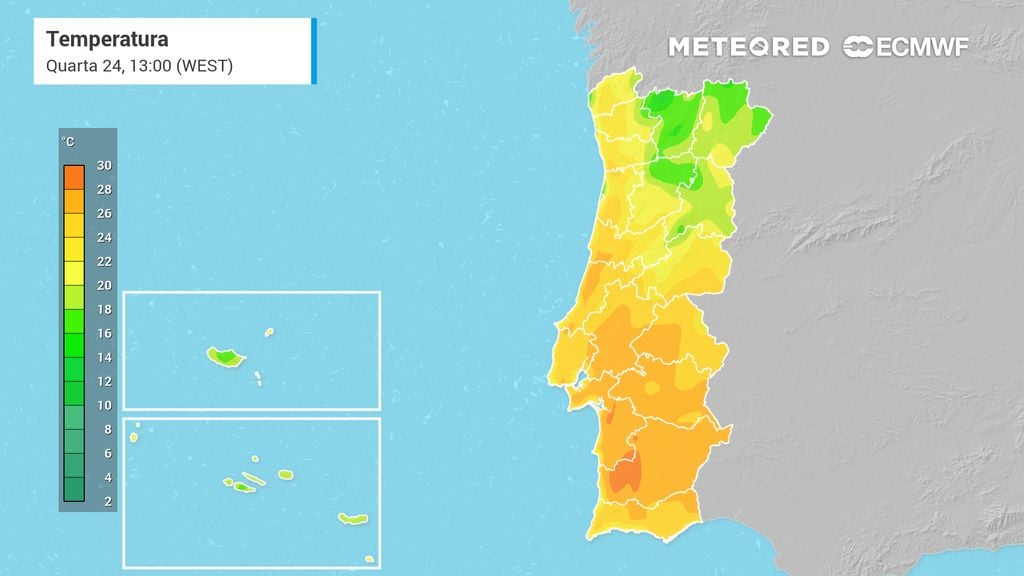 No dia 24, Portugal continental registará um verdadeiro cenário de verão. O fluxo de leste mantém o ar seco e quente, favorecendo temperaturas ainda mais elevadas. O interior do Alentejo e do vale do Tejo poderão ultrapassar os 29 ºC, enquanto no litoral norte e centro as máximas rondarão os 25 ºC. O mar, mais calmo e ligeiramente aquecido após dias de nortada, oferece boas condições para praia, tanto na Costa Ocidental como no Algarve. O céu permanecerá azul, apenas com véus de nuvens médias-altas.
