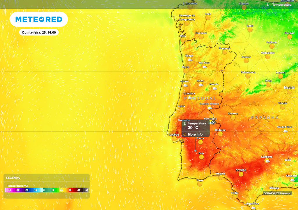 Para quinta-feira, 25 de setembro, trará continuidade do padrão. A massa de ar quente e seca mantém-se sobre Portugal Continental, resultando em dias claros e temperaturas acima da média para a época do ano. As mínimas continuarão a subir ligeiramente, ficando próximas dos 18 ºC em algumas áreas territoriais, como Lisboa e Faro. As máximas mantêm-se entre 23 e os 29 ºC na generalidade do território, localmente superiores em áreas do interior Centro e Sul. O vento de leste reforça o aquecimento junto ao litoral, mantendo o ambiente propício a atividades balneares.