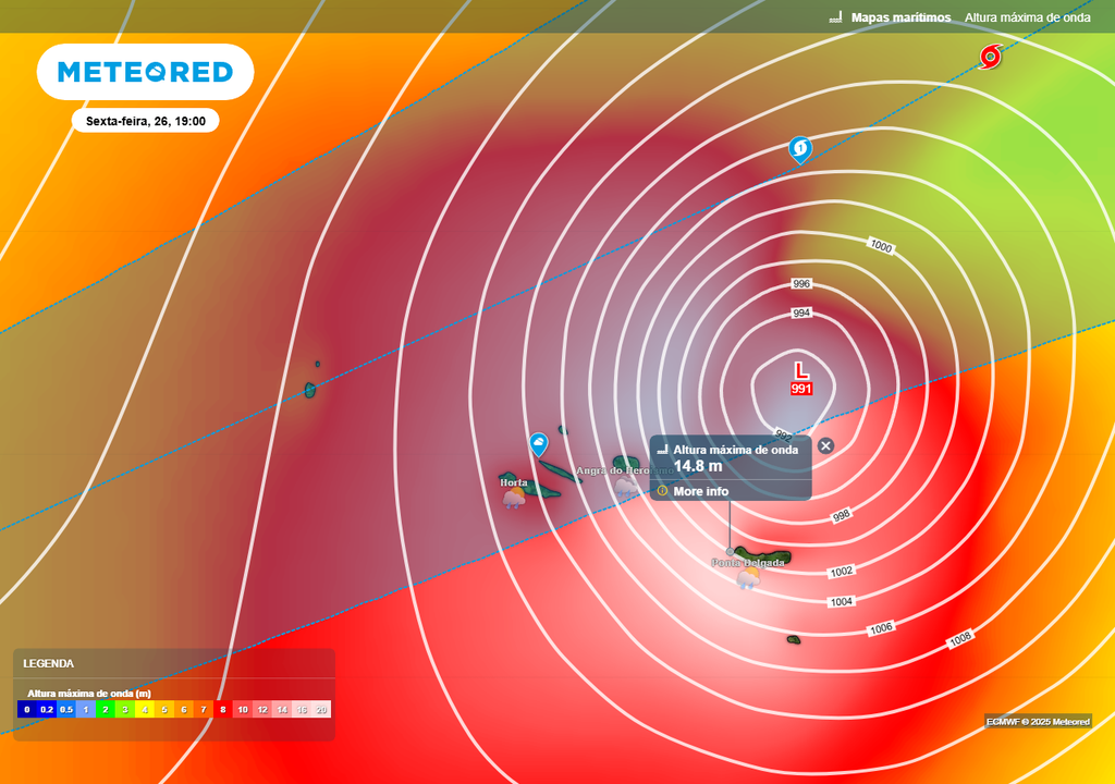 Por fim, os mapas antecipam um temporal marítimo muito agreste. A agitação marítima será extremamente perigosa para qualquer tipo de atividade próxima ou a decorrer no mar, pelo que é fortemente desaconselhado que, por motivos laborais ou de lazer, se aproxime do mar açoriano na sexta-feira, 26 de setembro.