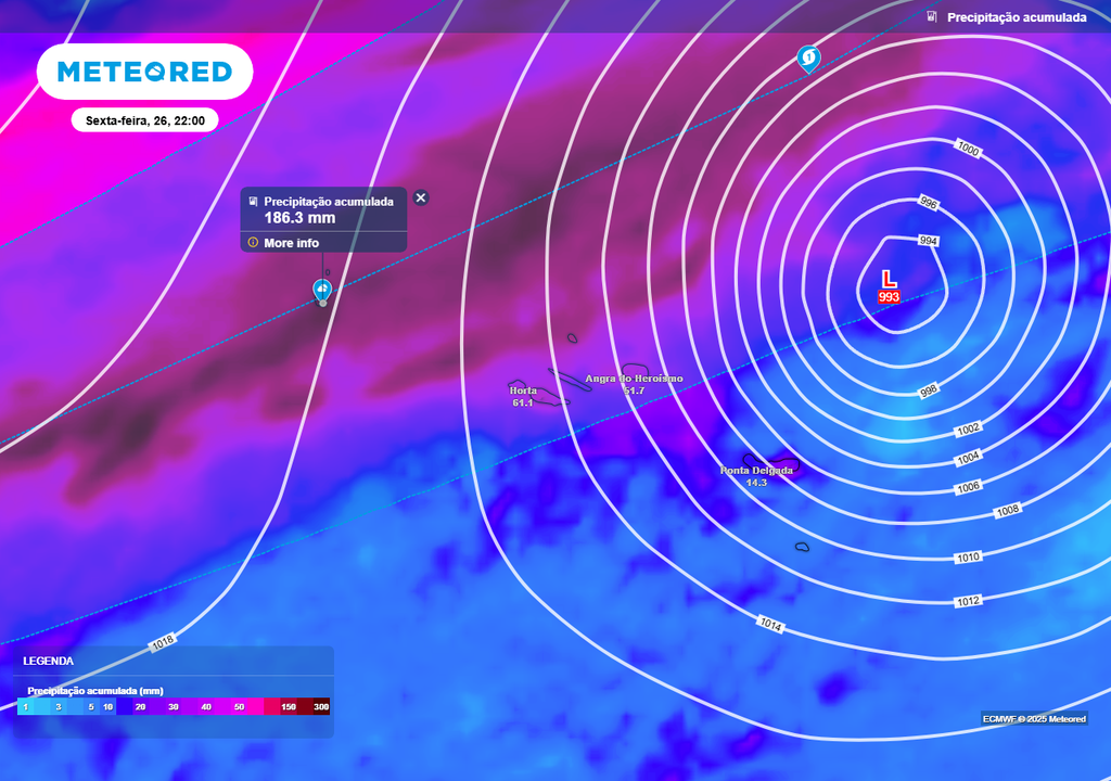 Ao contrário do indicado na última previsão, a mais recente atualização do modelo que merece a nossa maior confiança (ECMWF) coloca agora o Grupo Central dos Açores como o mais afetado pelo vento, com rajadas de vento a poderem ultrapassar os 170 km/h nas primeiras horas da tarde de sexta-feira, 26 de setembro, com particular destaque para a ilha do Pico.