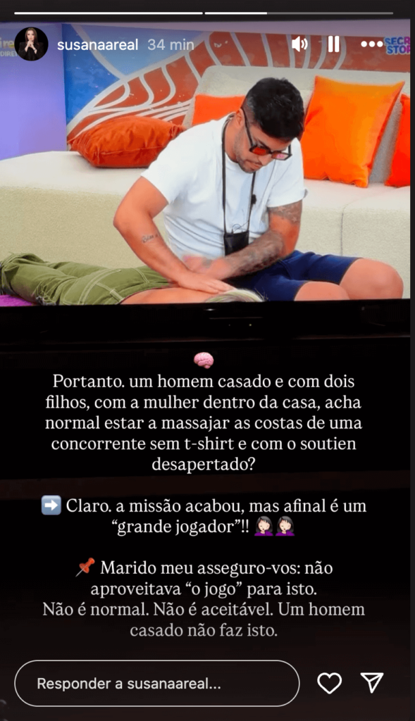 A especialista partilhou um vídeo em que Pedro Jorge estava esta tarde, a fazer massagens a Ana e atirou: “Portanto, um homem casado e com dois filhos, com a mulher dentro da casa, acha normal estar a massajar as costas de uma concorrente sem t-shirt e com o soutien desapertado?”