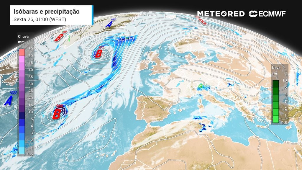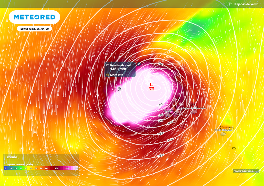 De acordo com a última atualização dos mapas de referência da Meteored, o centro de Gabrielle deverá passar entre os Grupos Ocidental e Central a partir da madrugada de sexta-feira (26).