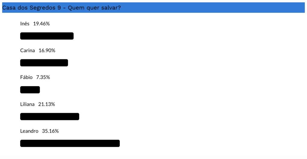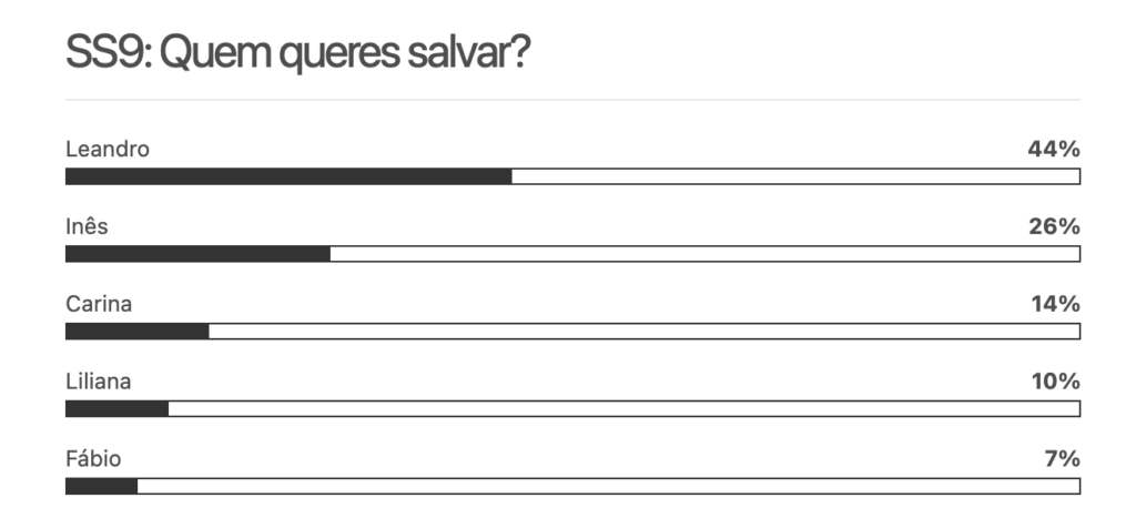Na sondagem que decorre no nosso blog, com 35,16% dos votos, Leandro é o concorrente mais votado para salvar, seguido de Liliana com 21,13% dos votos e Inês com 19,46% dos votos. Entre os menos votados temos Carina com 16,90% dos votos e Fábio com 7,53% dos votos.