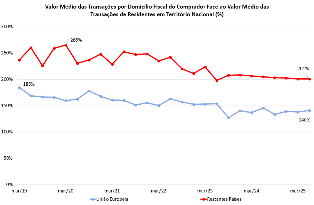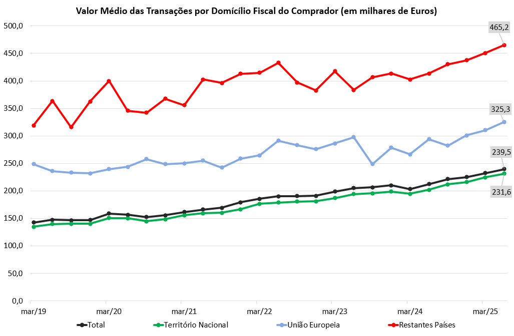 No 2º trimestre de 2025, um residente em Portugal adquiria imóveis com um valor médio de transações de €239 mil, um residente na União Europeia a €325 mil e um residente no resto do mundo a €465 mil.