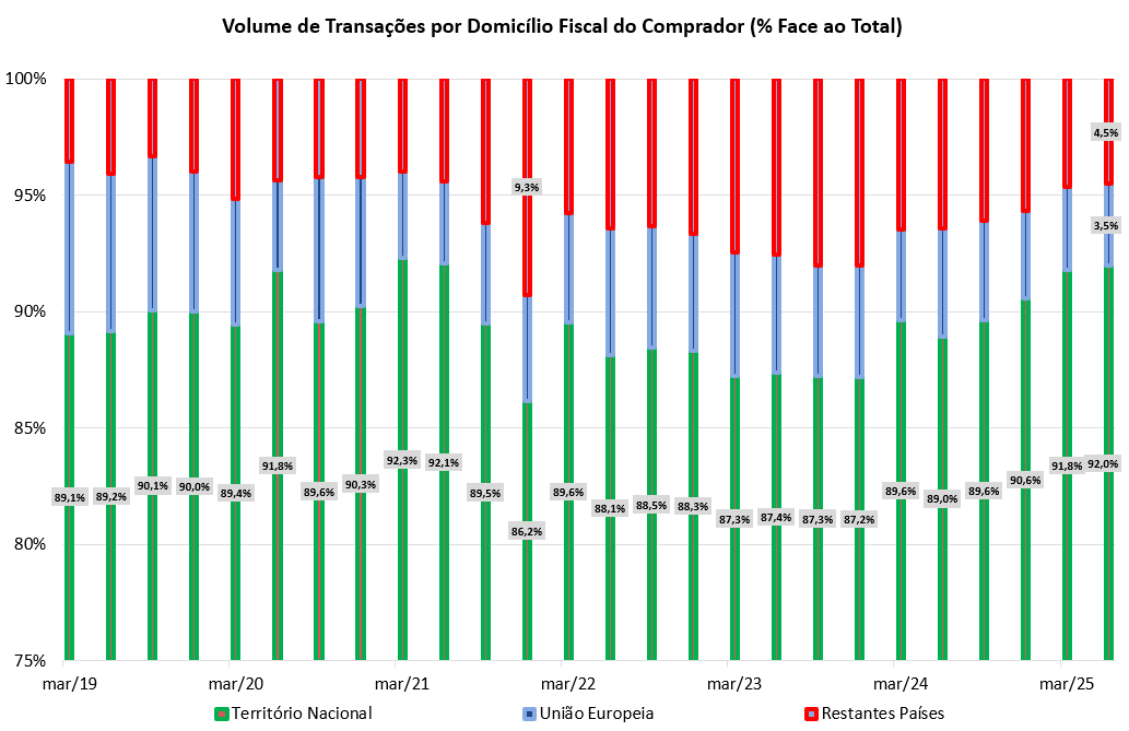 Outro dado relevante que identificámos é que o peso dos residentes no volume total de transações tem vindo a aumentar nos últimos quatro trimestres. Quando entre 2023 e meados de 2024 os residentes representavam cerca de 87% a 88% do total de investimento feito em aquisição de habitações, entre meados de 2024 e meados de 2025 esse peso subiu continuamente atingindo os 92% no 2º trimestre de 2025, uma fasquia que não era registada desde o 2º trimestre de 2021.