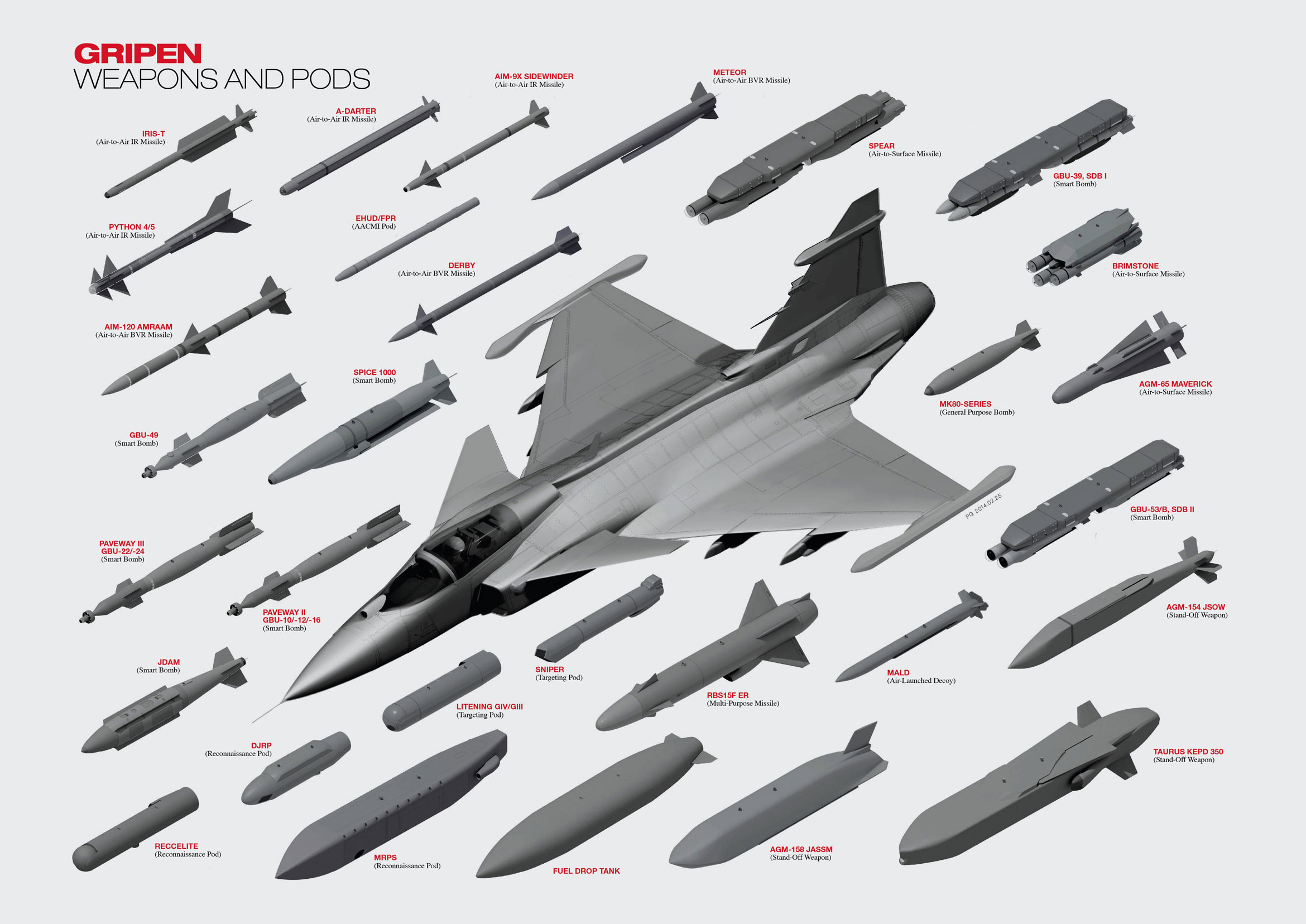 As cargas externas do Gripen E. Clique na imagem para ampliarAs armas e cargas externas do caça Saab Gripen E