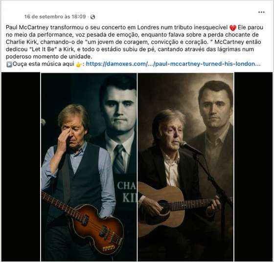 Apesar de, até ao momento, Paul McCartney não se ter pronunciado, é falso que o Beatle tenha prestado tributo a Charlie Kirk num concerto em Londres. Isto porque não só o artista não atuou na capital inglesa, como as imagens partilhadas nas redes sociais foram geradas por inteligência artificial.