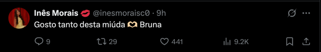 A bi-campeã dos reality shows mostrou-se rendida a Bruna e confessou: “Gosto tanto desta miúda. Bruna”. Mas Inês não se ficou por aqui e reagiu aos confrontos de Bruna com Liliana “Bruna 30 x -4 Liliana”.