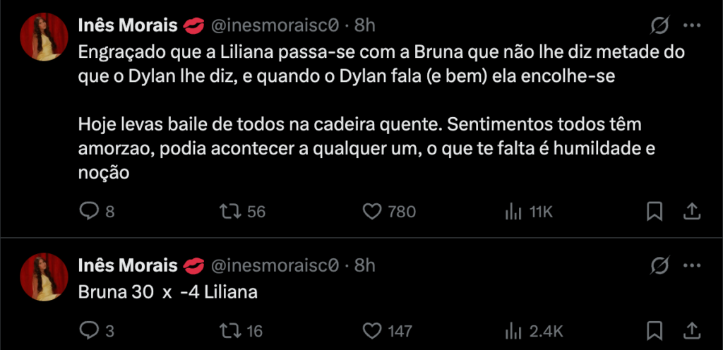 Inês destacou ainda: “Engraçado que a Liliana passa-se com a Bruna que não lhe diz metade do que o Dylan lhe diz, e quando o Dylan fala (e bem) ela encolhe-se Hoje levas baile de todos na cadeira quente. Sentimentos todos têm amorzão, podia acontecer a qualquer um, o que te falta é humildade e noção”.