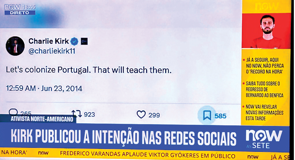 O Now, que é uma espécie de CMTV com fato e gravata, alegou e escreveu que “Charlie Kirk quis colonizar Portugal em 2014”. O Now não explicou, não contextualizou, não desenvolveu, largou assim a bomba e seguiu para outras notícias. Na verdade, o tweet Let’s Colonize Portugal foi publicado por Charlie Kirk depois do golo de Portugal contra os EUA no Mundial do Brasil em 2014. Longe de mim defender Kirk, eu sou é a favor da verdade desportiva.