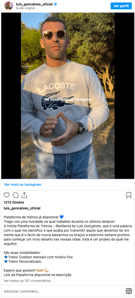 “Plataforma de treinos já disponível. Trago-vos uma novidade na qual trabalhei durante os últimos tempos! A minha Plataforma de Treinos – Resiliente by Luís Gonçalves, que é uma palavra com o qual me identifico e que acaba por transmitir aquilo que devemos ter em mente que é o facto de nunca baixarmos os braços e estarmos sempre prontos para começar um novo desafio nas nossas vidas.”, começou por anunciar Luís.