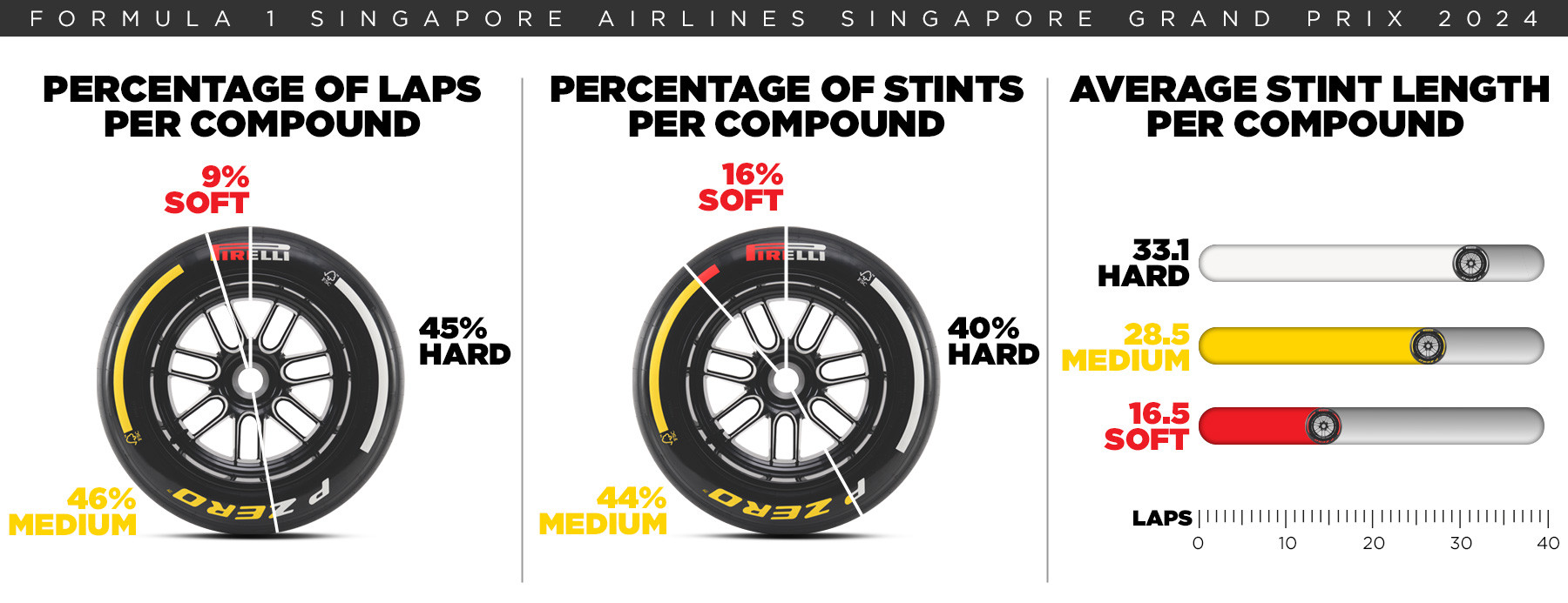 A Pirelli voltará a fornecer os compostos C3 (Duro), C4 (Médio) e C5 (Macio) a Singapura, descartando o C6, mais macio, devido ao risco de sobreaquecimento a altas temperaturas. O stress térmico é o principal fator de degradação dos pneus em Marina Bay.