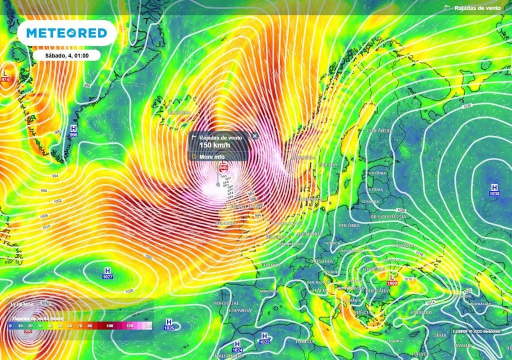 Entretanto, é para sábado (4) que se prevê que a frente associada à depressão que impactará as Ilhas Britânicas, atravesse o Norte da Península Ibérica, podendo gerar períodos de chuva fraca ou chuvisco em zonas do litoral Norte. Um dos aspetos mais marcantes da passagem da frente será o forte temporal de vento de Oeste, que produzirá rajadas até 50 km/h no litoral Oeste (distritos de Leiria e Lisboa) e nalguns locais montanhosos do extremo Norte (distrito de Vila Real).