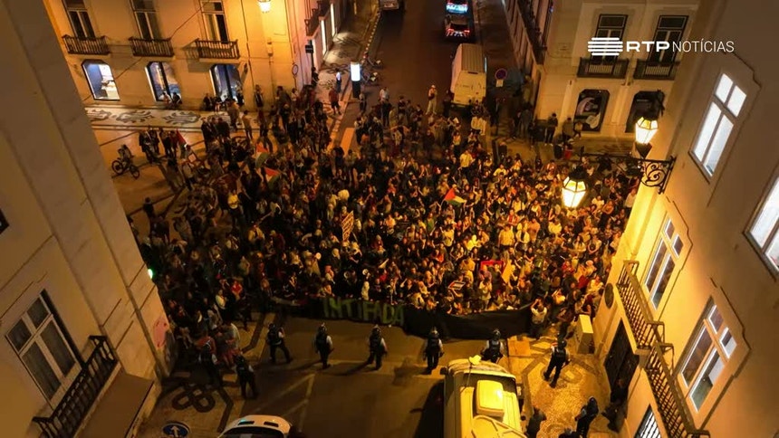 A manifestação que estava frente à embaixada de Israel, desceu até ao Marquês de Pombal. Já nesse local cerca de 100 manifestantes cortaram a Rua Augusta, cerca das 23h00, nos dois sentidos, e concentraram-se junto ao MUDE – Museu do Design, enquanto decorria o debate dos nove candidatos à Câmara Muncipal de Lisboa, transmitido pela RTP.Os manifestantes gritavam mensagens como “Palestina Livre” e palavras de ordem contra o presidente da Câmara de Lisboa, Carlos Moedas. No local estão presentes mais de dez agentes da polícia.