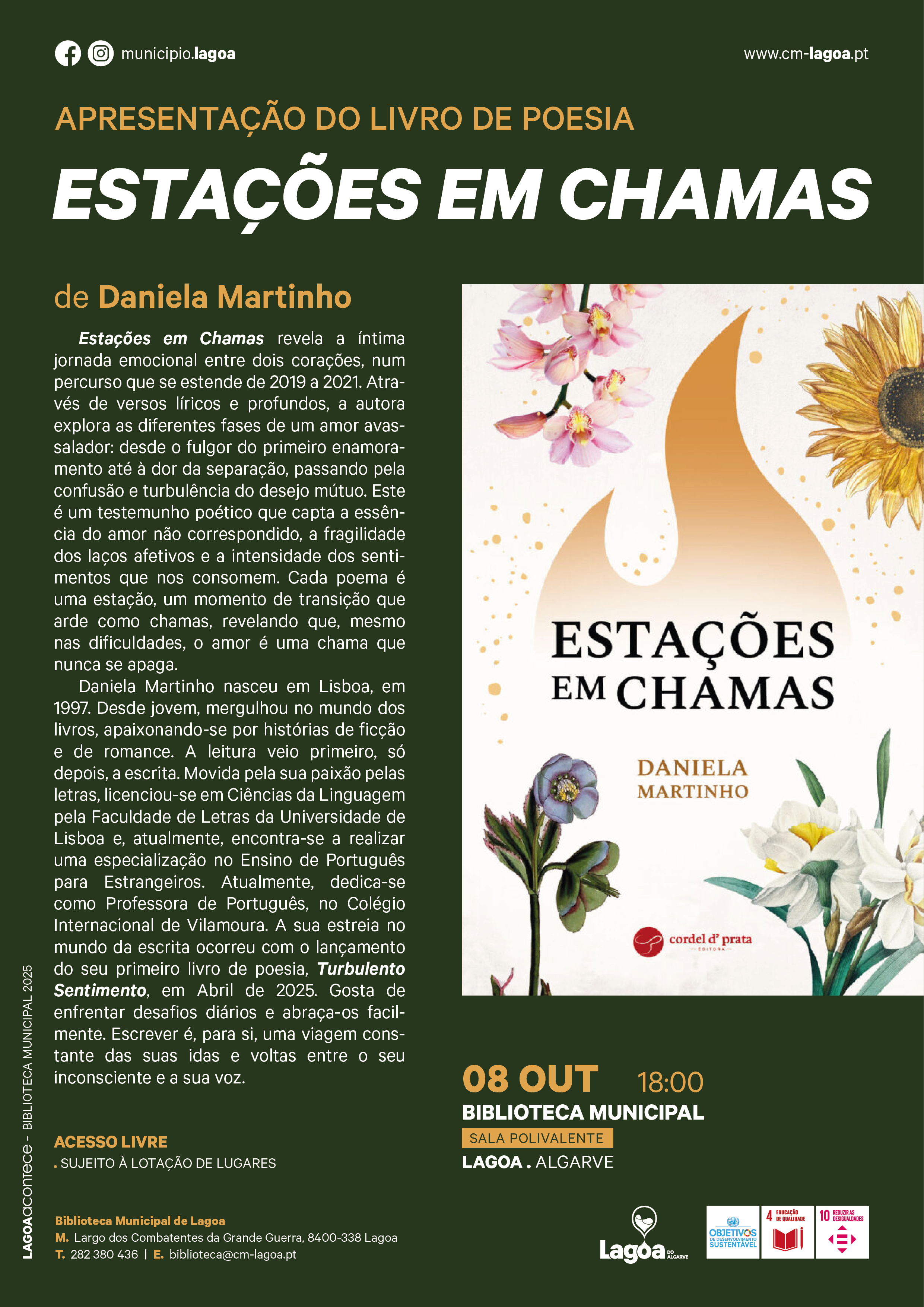 A cidade de Lagoa, no Algarve, será palco da apresentação do mais recente livro de poesia de Daniela Martinho, intitulado “Estações em Chamas”. Uma obra que revela, de forma profunda e íntima, a jornada emocional de dois corações através de versos líricos e intensos.