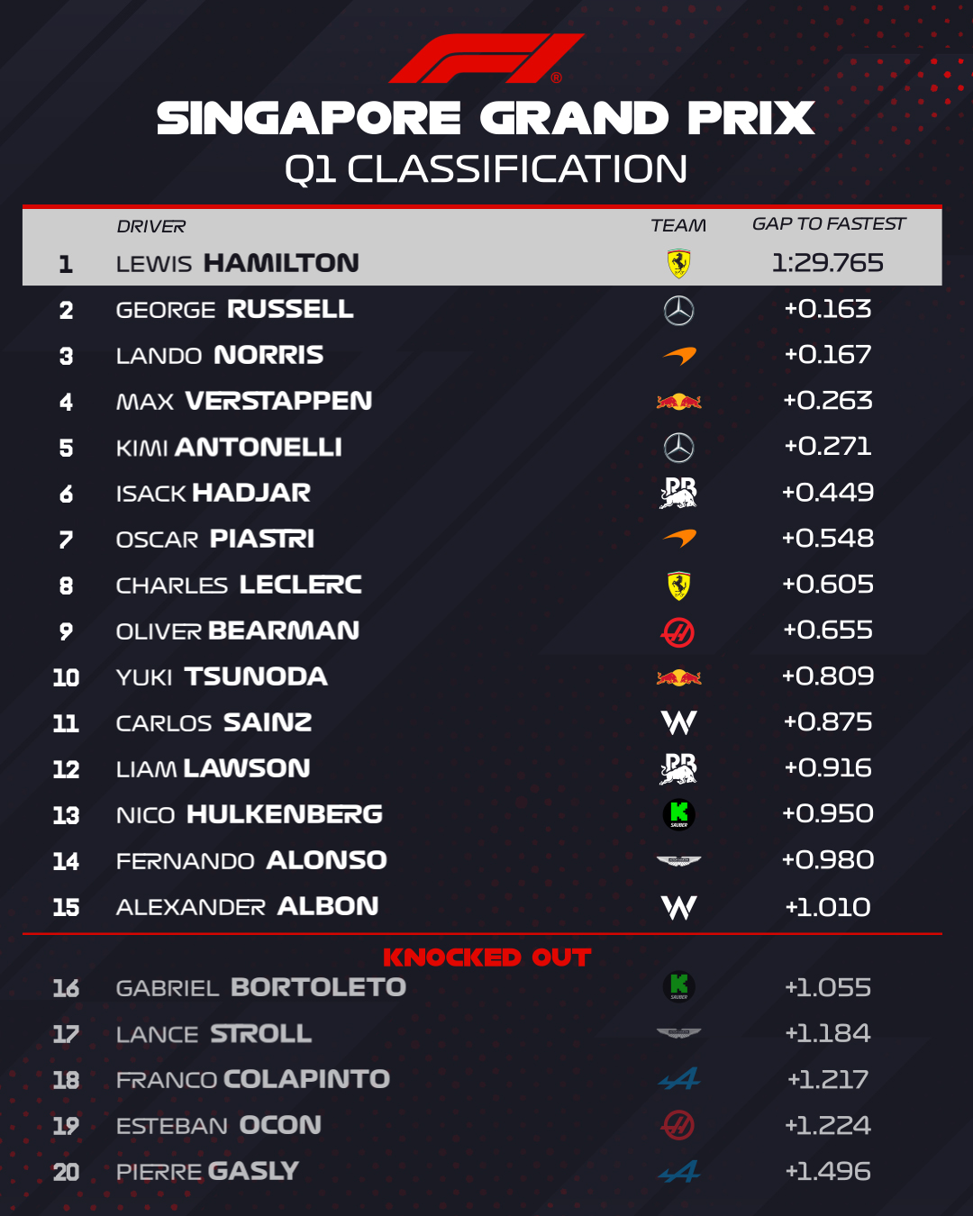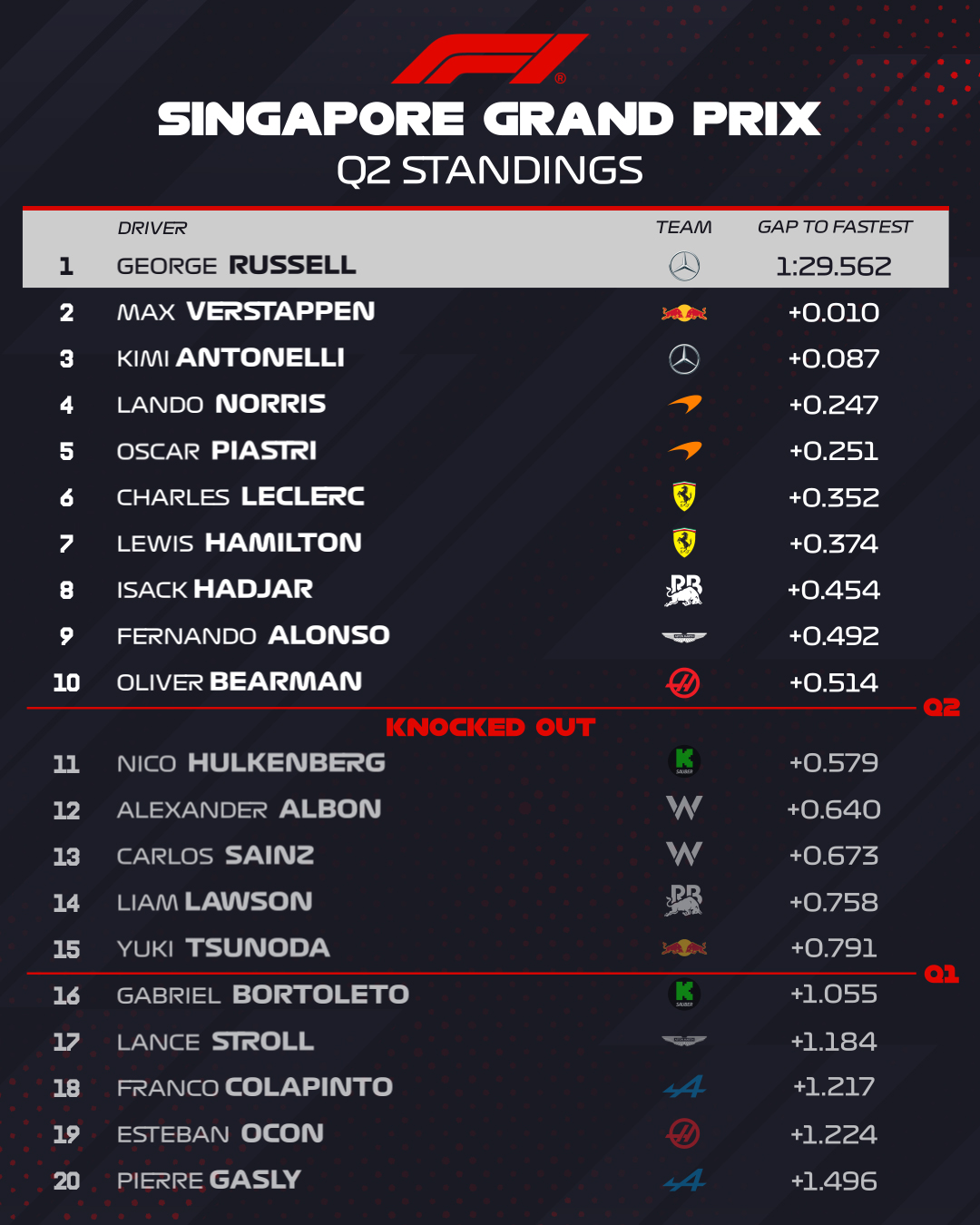 Na segunda tentativa, Norris não conseguiu melhor que o quinto posto, ficando a ver Leclerc a não melhorar o seu primeiro registo e Russell a melhorar o seu tempo. Verstappen estava a fazer um tempo muito bom, mas o segundo setor não lhe sorriu e levantou o pé. Russell ficou com a pole para o GP de Singapura, seguindo de Verstappen e Piastri. Antonelli e Norris completaram o top 5. Hamilton, Leclerc, Hadjar, Bearman e Alonso eram os homens que se seguiam no top 10.