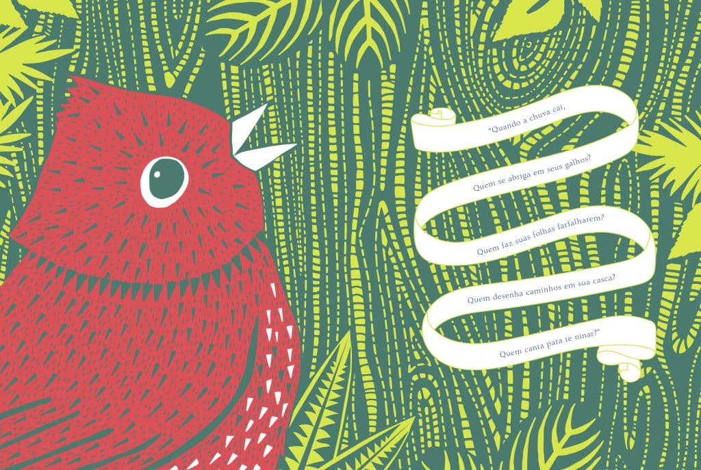 Juntos, os animais que o pequeno pássaro vermelho encontra compõem a canção da árvore destacada no título. Uma canção que se faz de muitas vozes, de muitas vidas — da biodiversidade.