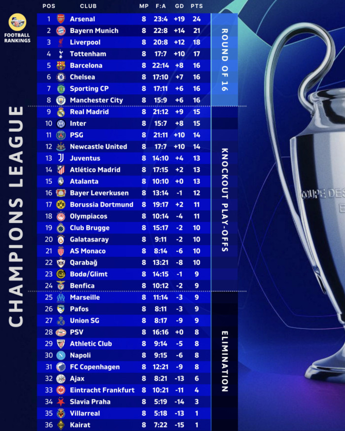 Echipele calificate în play-off: Real Madrid, Inter, PSG, Newcastle, Juventus, Atletico Madrid, Atalanta, Leverkusen, Dortmund, Olympiacos, Brugge, Galatasaray, Monaco, Qarabag, Bodo/Glimt, Benfica