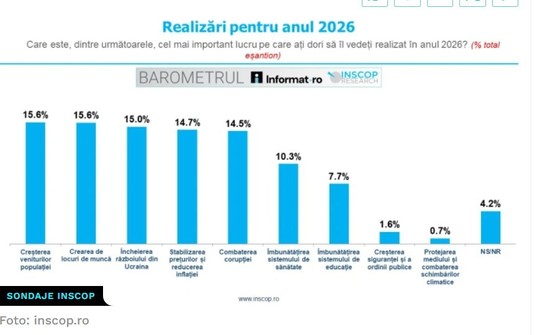 Întrebaţi care este cel mai important lucru pe care ar dori să îl vadă realizat în anul 2026, 15.6% dintre respondenţi menţionează creşterea veniturilor, 15.6% crearea de locuri de muncă, iar 15% încheierea războiului din Ucraina.