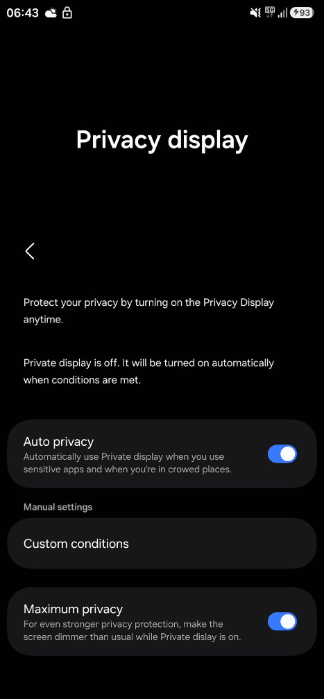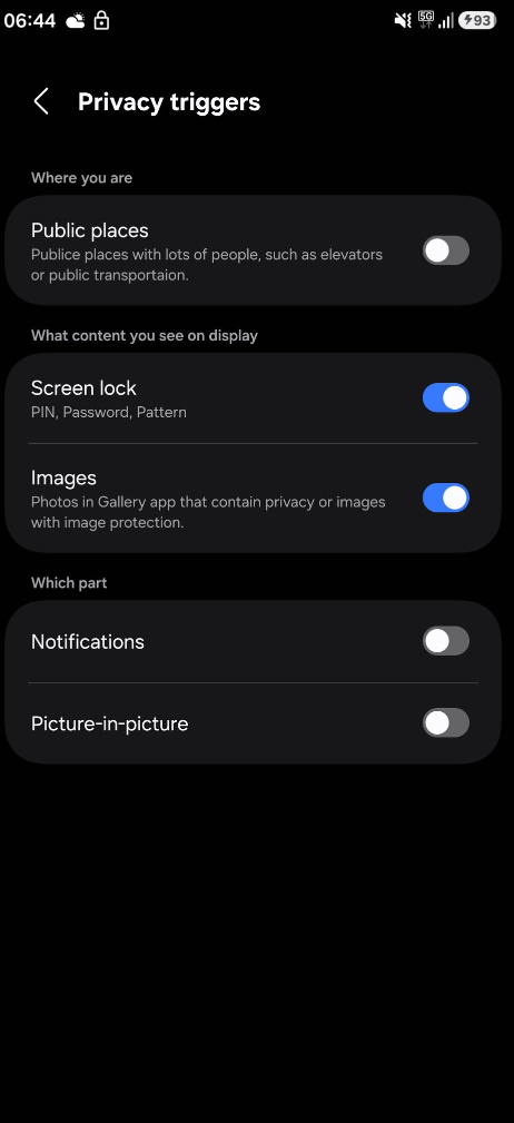 Sunt mai multe scenarii ce declanșează automat funcția de Privacy display și poți alege ce dorești a fi ascuns, de la notificări, fotografii, pattern de deblocare etc. Mi se pare o idee bună, iar cei ce alegeau o folie de protecție pentru asta, au parte de ajutor din partea Samsung spre a ascunde conținutul afișat pe telefon în spațiile publice sau când dorești.