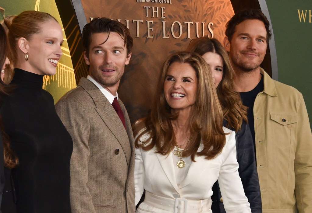 Patrick Schwarzenegger alături de soția sa Abby Champion (stânga), de mama sa Maria Shriver (centru), de sora sa Katherine Schwarzenegger și de soțul acesteia, actorul Chris Pratt, la premiera sezonului 3 al serialului HBO „The White Lotus”., FOTO: Chris Delmas / AFP / Profimedia Images