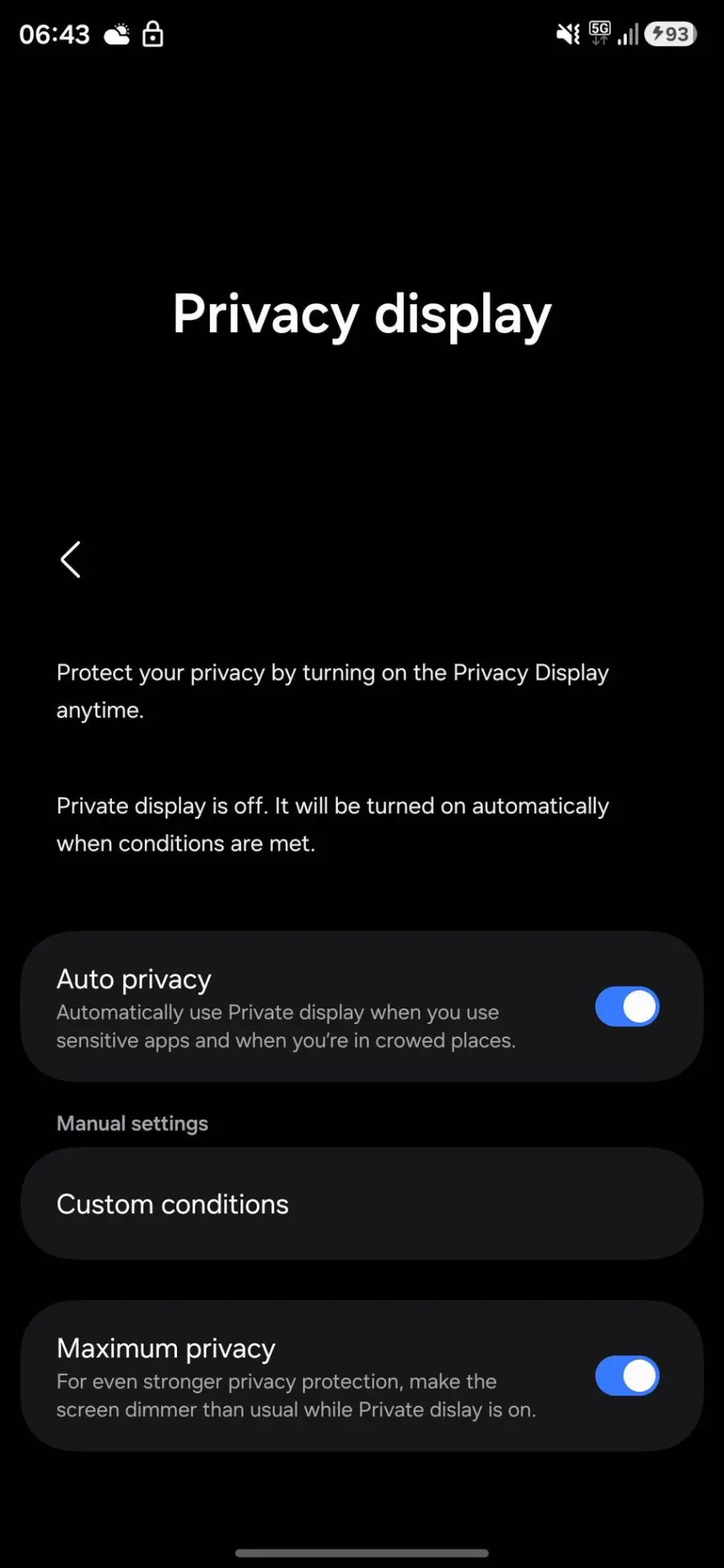 Inițial, funcția a fost observată în codul One UI 8.5, funcția Privacy Display este descrisă astfel: „Limitează vizibilitatea ecranului din unghiuri laterale pentru a vă proteja confidențialitatea în public”.