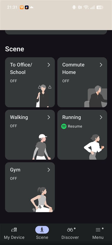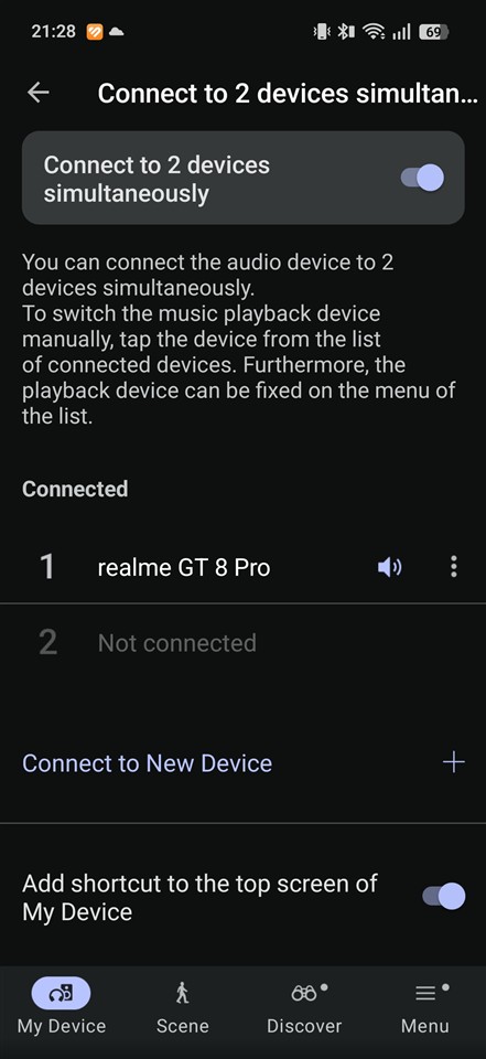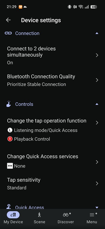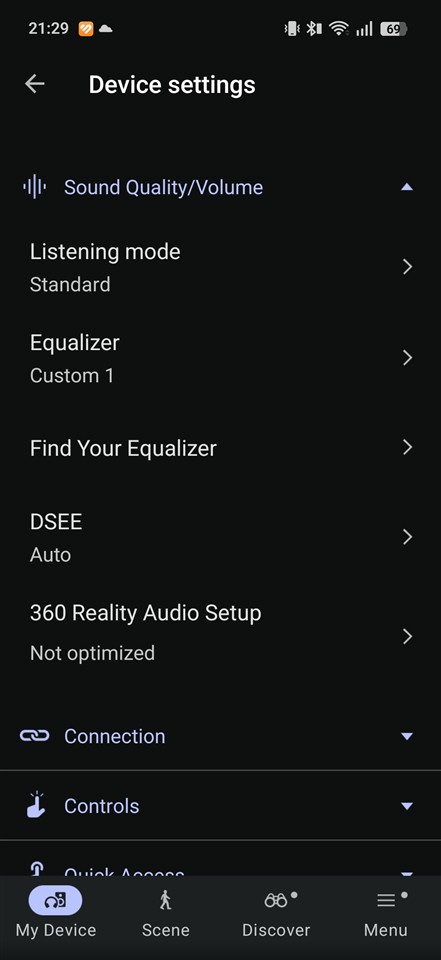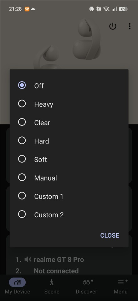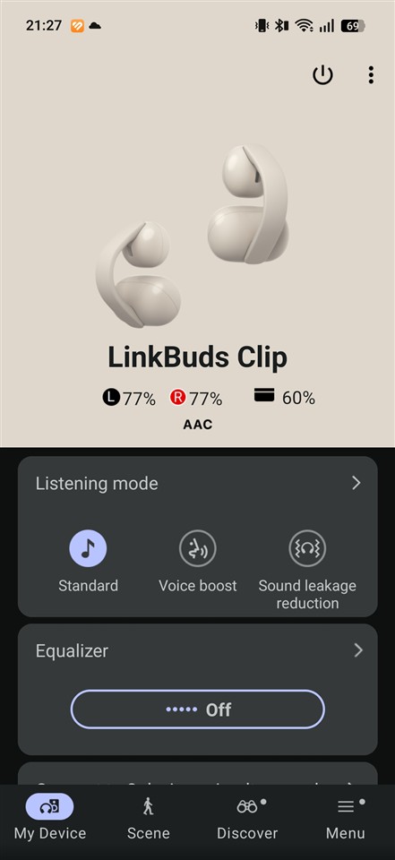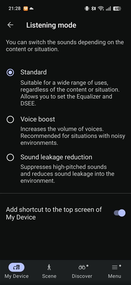 În aplicație avem trei moduri pentru profilurile de sunet: Standard, Voice boost (chiar scoate în evidență vocea) și Sound leakage reduction. Ultimul ar trebui să limiteze sunetul care „iese” pe lângă căști, care ajunge și la urechile celorlalți din jurul tău. Doar că ceea ce face este să taie unele frecvențe, care oricum, așa cum am tot amintit, oricum nu prea sunt pe acolo… Din partea mea, Sound leakage reduction nu prea merită activat, mai simplu este să scazi tu volumul dacă vrei să păstrezi un grad de intimitate.