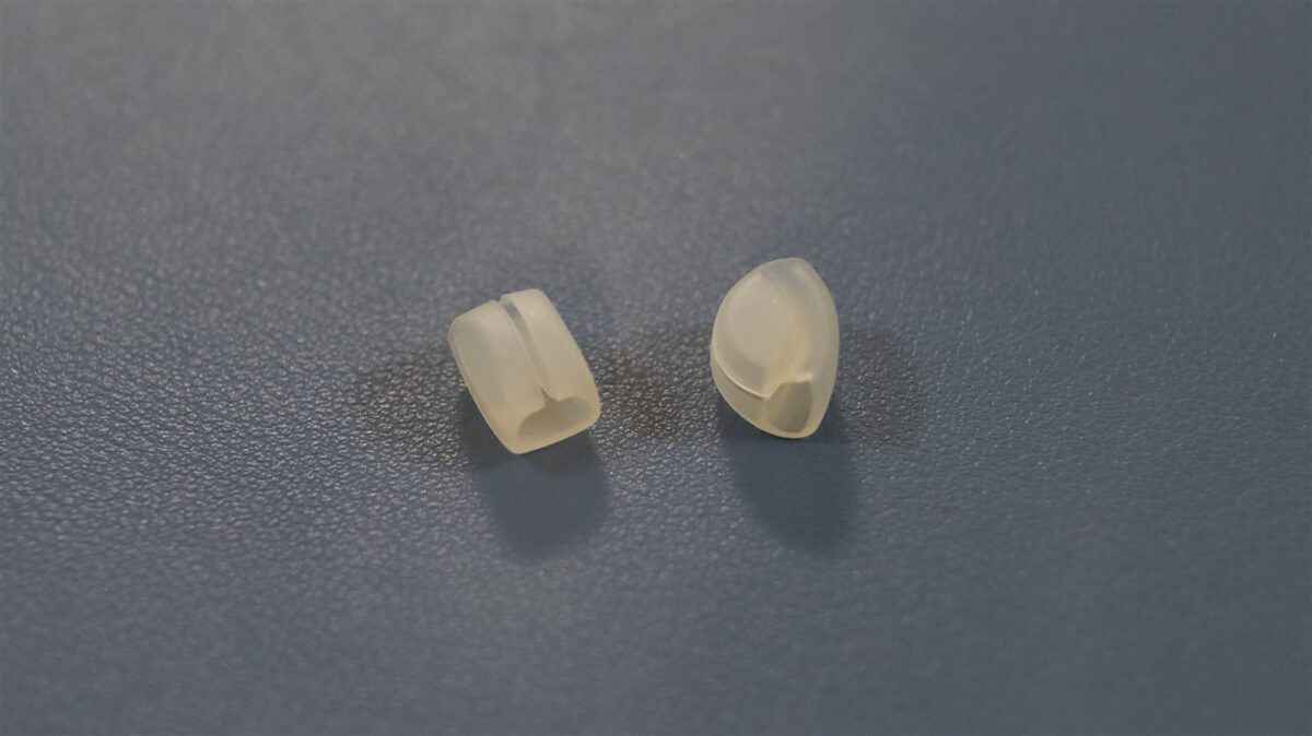 Spuneam că sunt și două manșoane. Acestea pot fi montate pe banda ce „leagă” căștile propriu-zise de elementul din spatele urechii. Vei folosi aceste manșoane dacă crezi că Sony LinkBuds Clip nu se fixează, nu se așează suficient de bine pe exteriorul urechii.