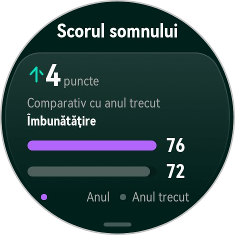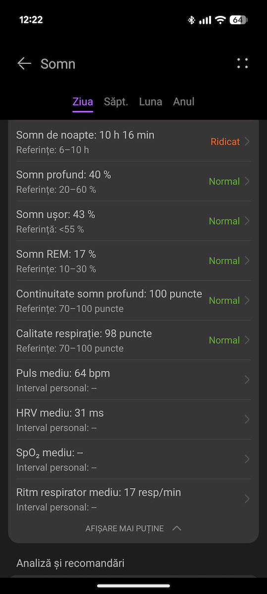 Realizează și o analiză detaliată a somnului cu diferitele etape ale sale (somn profund, somn ușor, somn REM etc), îți dă și un scor pentru somn.